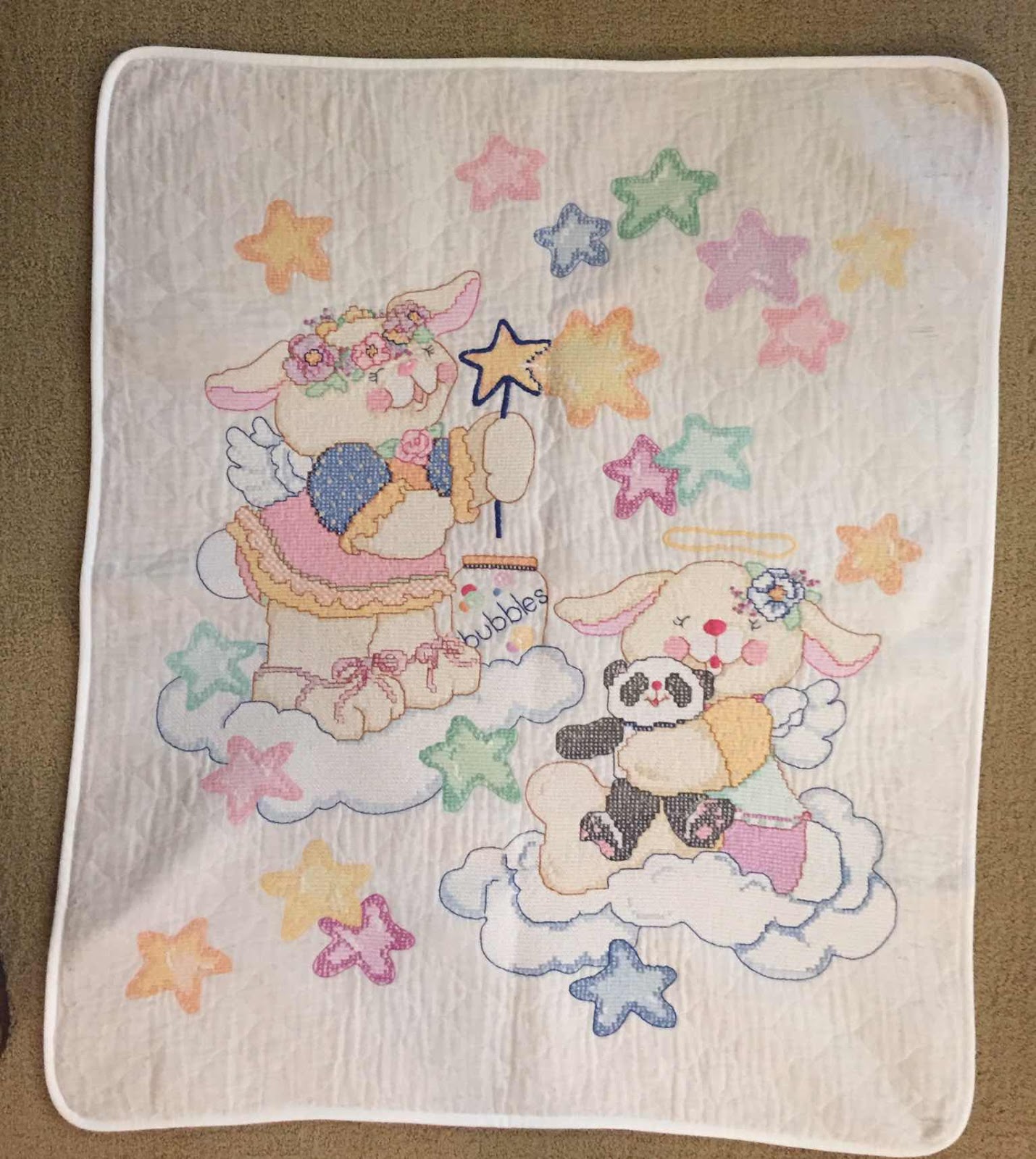 My friend Noe asked me to repair the back and binding of her daughter’s baby quilt. Her daughter is in college and says she needs the quilt to get through her last year. The top is also in bad shape and I tried to convince Kiley to keep it in a zippered case to protect it rather than fix it. But she really wanted the back and binding repaired. So, I did. The back was never quilted to the front, so it was fairly easy to repair. I “quilted” with an iron, using Misty Fuse to bond the top to the new back. I used white flannel for the back which was in my stash, left from a baby quilt project many years ago. The white fabric for the bias binging was also in my stash. I had Misty Fuse and white thread, so nothing was purchased for the project. I rather doubt that the top will last one more washing, but maybe Kiley will be finished with college by then. Binding the round corners was not a perfect job. I need more practice.