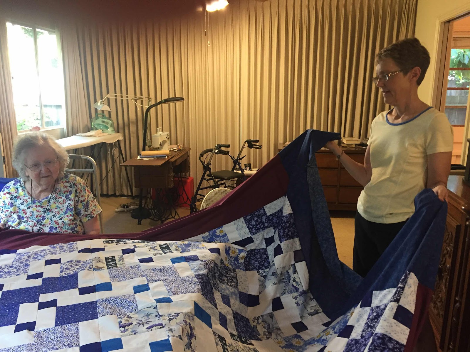 Mother and Miff Unpacking the Quilt in August—EGADS!
