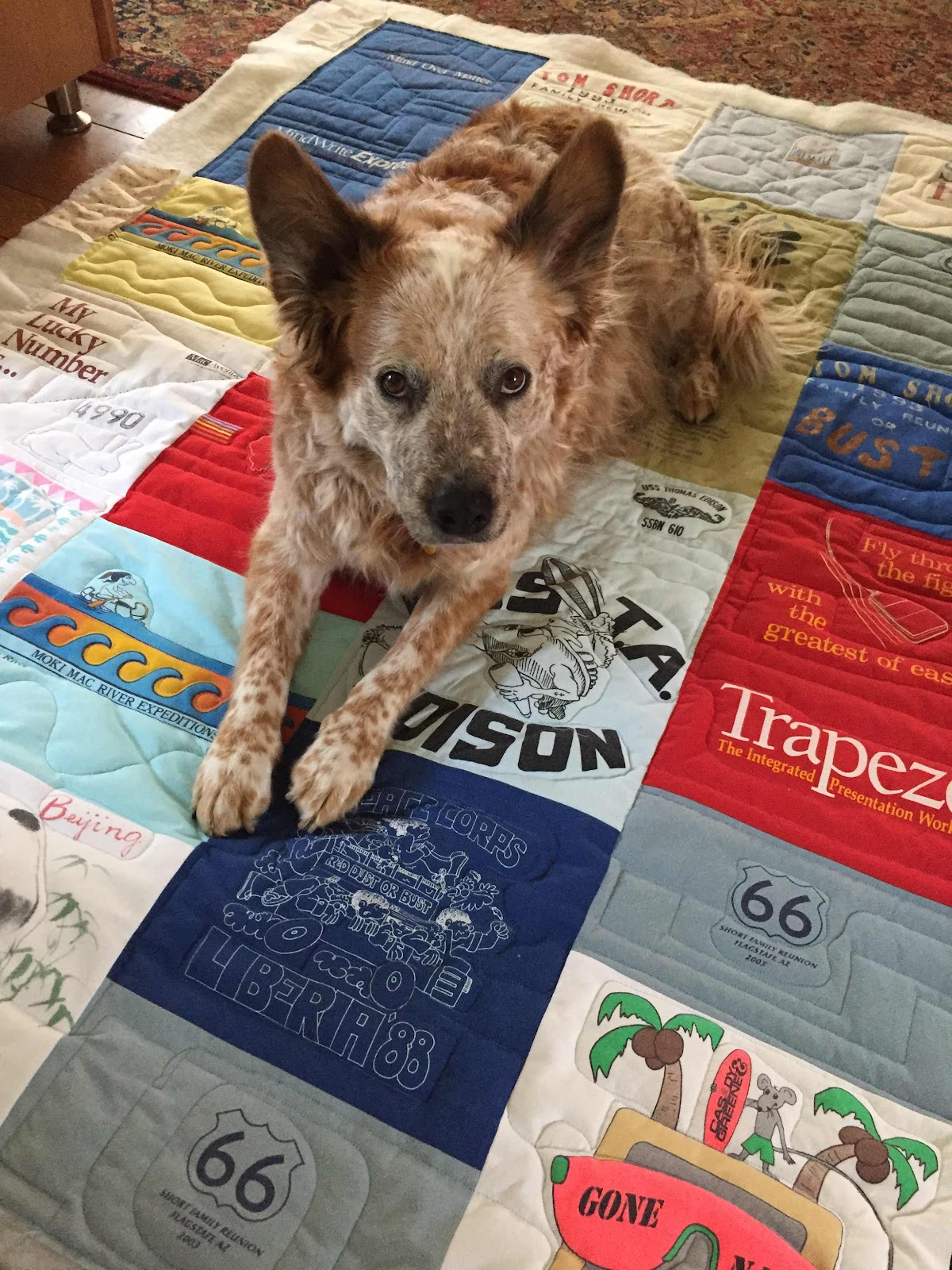 The Tom Short Reunion t-shirts have functioning pockets. For some ill planned reason, the T.A. Edison submarine shirt throwing torpedoes and shooting a missile, wound up next to the Peace Corps shirt. Not all of the shirts were Daddy’s. To round out the quilt I used a few shirts from my collection, but my shirts were ones he had a connection to or gave me as a souvenir from his travels.