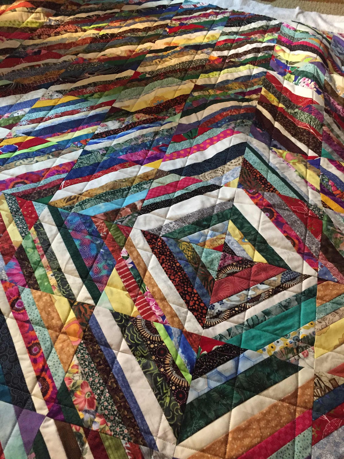 - Quilting: Quilted in straight vertical and horizontal lines. After the vertical lines were completed, the quilt was remounted to do the horizontal lines. Used light gray 100% polyester thread (Omni from Superior Threads-named "Silver"). 5 bobbins. Quilting by Patty.