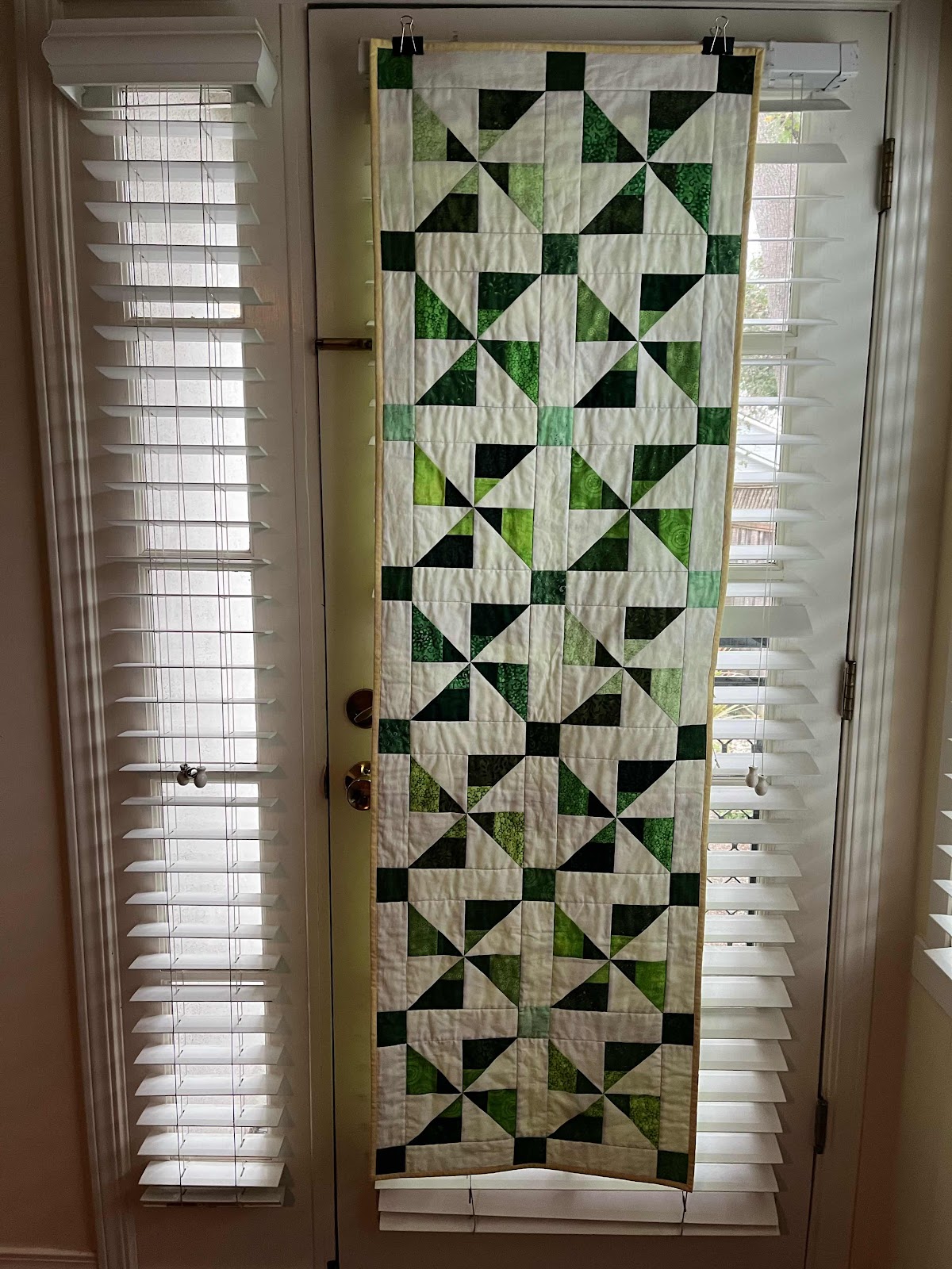 I watched a video from Misty at MSQC about making this table runner. So, I decided to make a green and white one for St. Patrick’s Day.